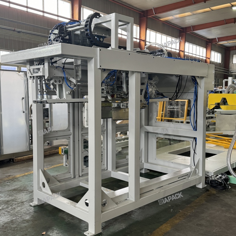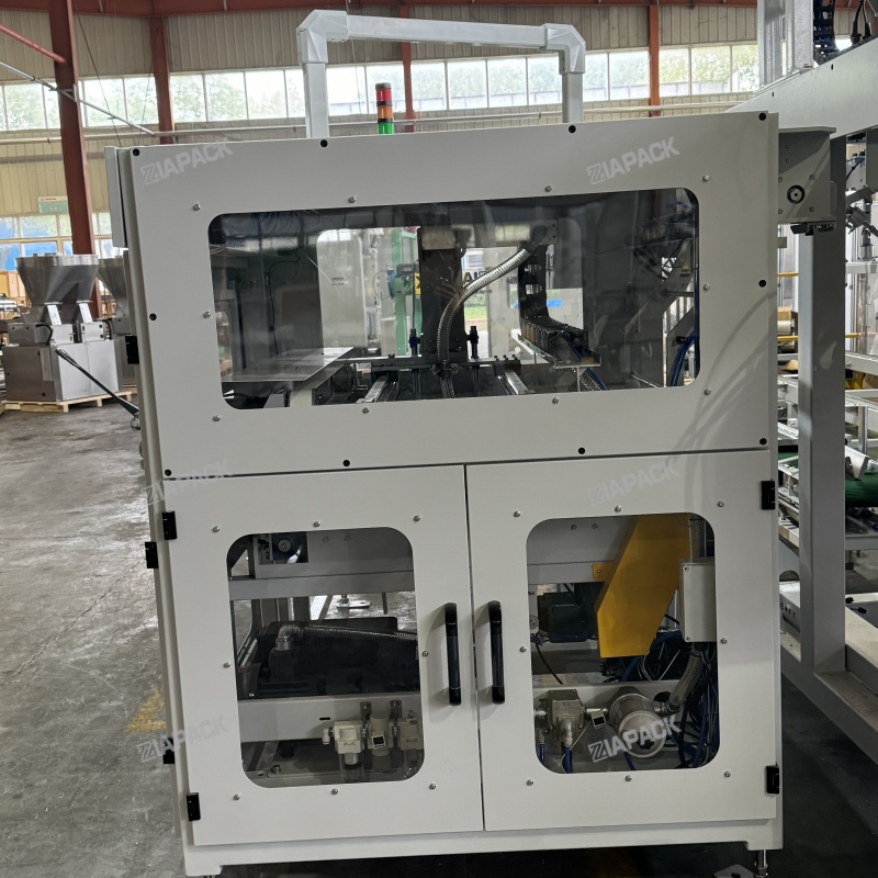1). Përshtatshmëri e gjerë ndaj çantave të paketimit. Makina e paketimit përdor metodën e marrjes së çantave, domethënë, qesja merret nga depoja e përgatitjes së çantave, qesja vendoset në qendër dhe pozicionohet, qesja dërgohet përpara, gryka e qeses pozicionohet, qesja hapet paraprakisht, manipuluesi i ngarkimit të çantave fut thikën në grykën e qeses për ta hapur atë dhe pastaj e ngre qesen lart.