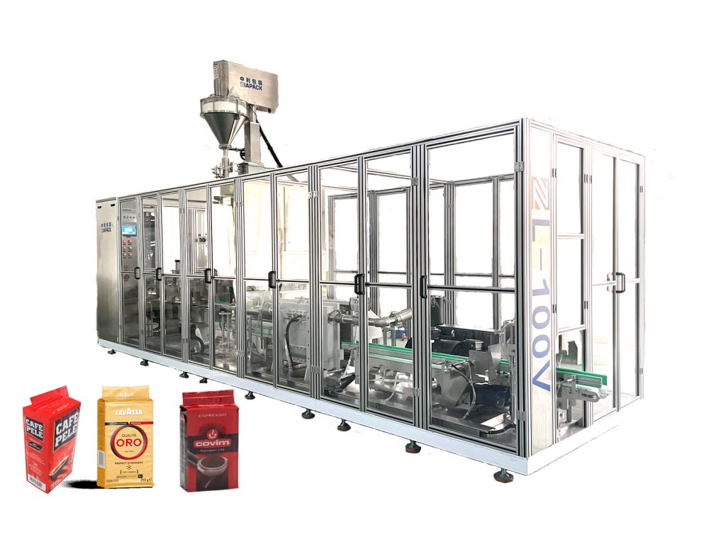 Kjo makinë përfshin një grup ZL520 vertikale për paketimin dhe vulosjen e qeseve. një grup makine peshimi me dy kova ZL2000, një makinë paketimi me vakum ZL-100V dhe një transportues të grupit të prodhimit. Kjo makinë përdoret gjerësisht për paketimin e kimikateve të farmacive ushqimore dhe produkteve të tjera në pluhur ose granula të vogla. Ashtu si pluhuri i kafesë, pluhuri i majave dhe kështu me radhë. E gjithë makina pompon brenda produktit me vakum. Shkalla e vakumit është shumë e lartë dhe shpejtësia e paketimit është shumë e lartë mund të arrijë 15 qese/min. Produkti i përfunduar është shumë i bukur dhe ka një raft të gjatë jeta.