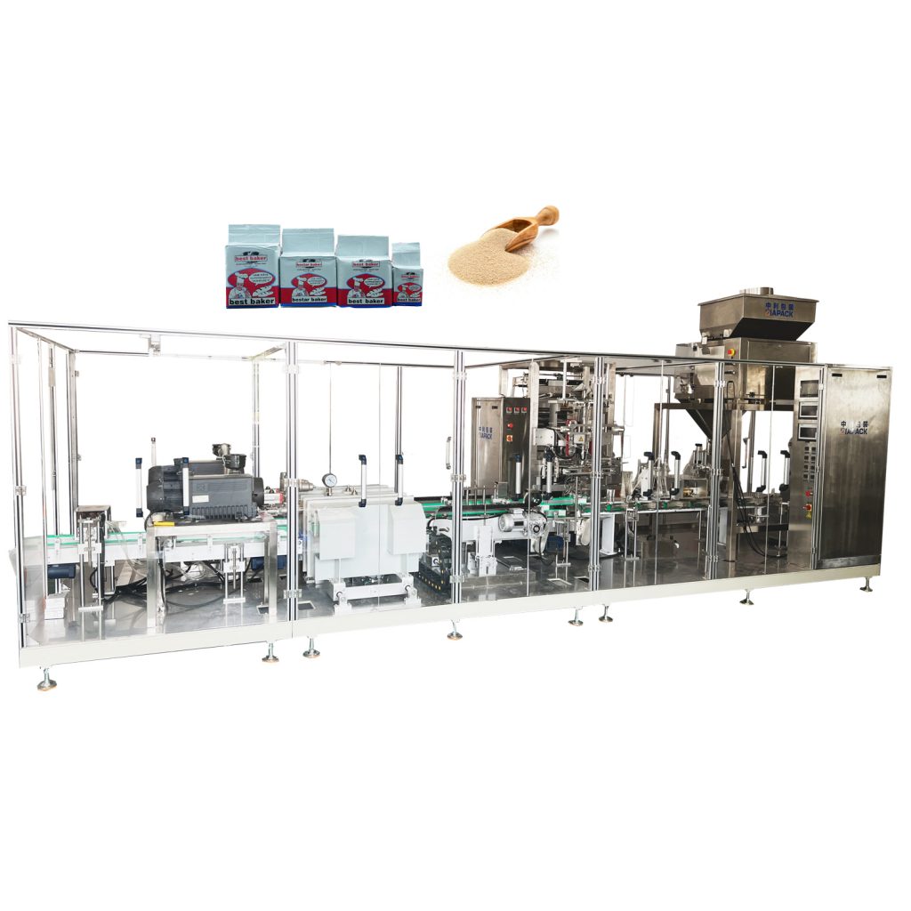 Kjo makinë përfshin një ashensor vakum ZK3 për ushqimin e majave të thata, një grup ZL520 vertikale për paketimin dhe mbylljen e qeseve. Një grup makinerie peshimi me katër kova ZLC4-2000, Makinë paketimi me dy dhoma me vakum ZL-100V2 me një grup. Kjo makinë përdoret gjerësisht për paketimin e kimikateve të farmacisë ushqimore dhe produkteve të tjera në pluhur ose granula të vogla. Si pluhur kafeje, pluhur maja miell gruri dhe kështu me radhë. E gjithë makina pompon brenda produktit në vakum. Shkalla e vakumit është shumë e lartë dhe shpejtësia e paketimit është shumë e lartë mund të arrijë 30 qese/min. Produkti i përfunduar ka një jetëgjatësi të gjatë dhe formë të bukur.