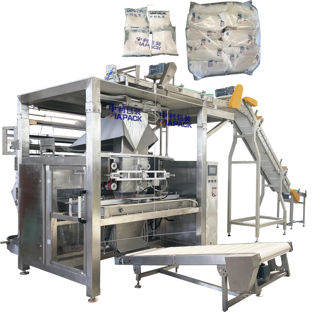 Kjo makinë është e përshtatshme për të paketuar çantën e vogël në çantën e madhe. Makina mund ta bëjë automatikisht qesen dhe të mbushë qesen e vogël dhe më pas të mbyllë qesen e madhe. Kjo makinë përfshin njësitë e mëposhtme: